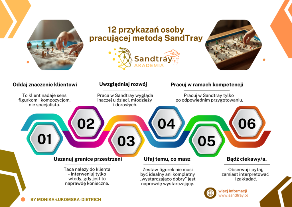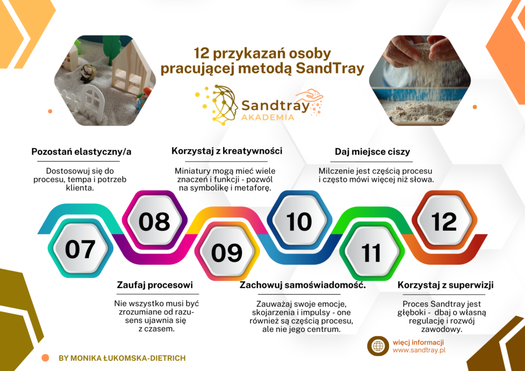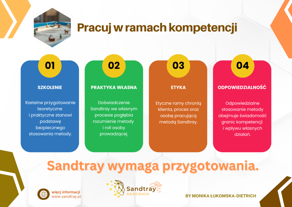 Metoda Sandtray opiera się na bezpieczeństwie, relacji i zaufaniu do procesu. To klient nadaje znaczenie temu, co pojawia się w piasku, a rolą osoby prowadzącej jest stworzenie ram, które ten proces chronią i wspierają. Uważność, ciekawość, etyka i kompetencje są fundamentem pracy, w której sens wyłania się w swoim tempie.