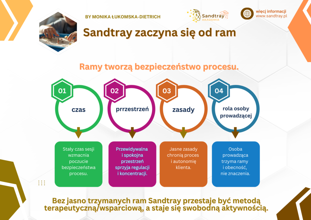 Ramy w Sandtray nie ograniczają, one chronią proces. Stały czas, bezpieczna przestrzeń, jasne zasady i uważna obecność osoby prowadzącej tworzą warunki, w których doświadczenie może rozwijać się w swoim tempie. Bez ram Sandtray traci swoją terapeutyczną i wspierającą jakość.