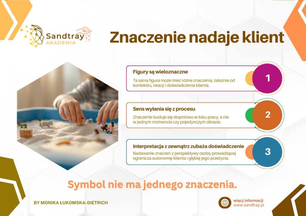 W metodzie Sandtray to klient nadaje znaczenie symbolom, figurom i układom. Sens nie pojawia się od razu, wyłania się stopniowo w toku procesu i kolejnych spotkań. Interpretacja „z zewnątrz” może spłycać doświadczenie i ograniczać autonomię klienta.