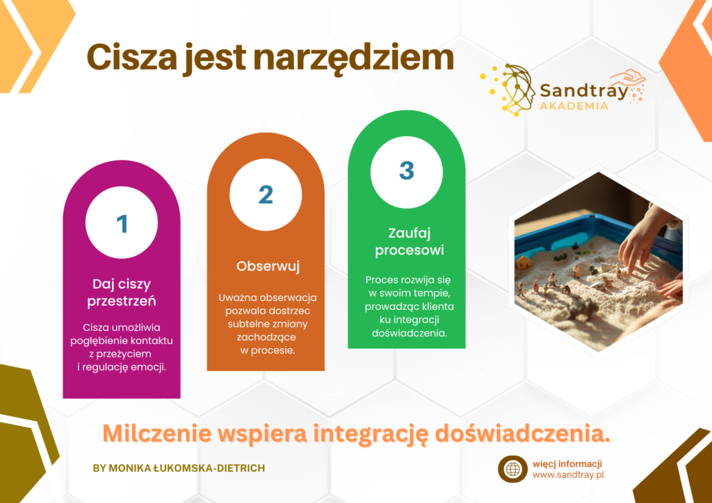 W metodzie Sandtray cisza nie jest brakiem działania, lecz ważnym narzędziem procesu. Daje przestrzeń na regulację emocji, pogłębienie kontaktu z doświadczeniem i zauważenie subtelnych zmian. Zaufanie do tempa procesu pozwala sensowi wyłaniać się naturalnie, bez pośpiechu i nacisku.