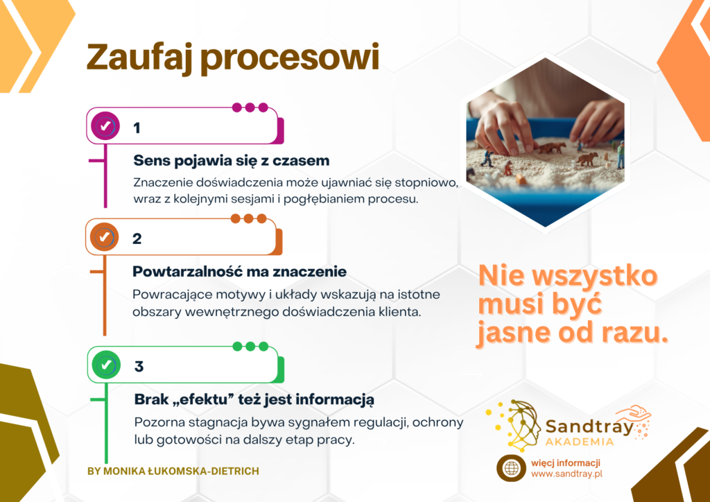 W pracy metodą Sandtray znaczenie nie zawsze pojawia się od razu, często wyłania się stopniowo, wraz z kolejnymi sesjami i powracającymi motywami. Nawet pozorny „brak efektu” jest informacją o procesie, regulacji lub gotowości na następny etap. Zaufanie do tego rytmu pozwala nie przyspieszać tego, co potrzebuje dojrzeć.