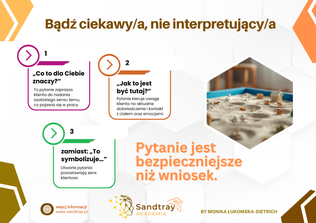 W metodzie Sandtray ważniejsza od wniosków jest ciekawość i otwartość na doświadczenie klienta. Pytania pomagają zatrzymać się przy tym, co „tu i teraz”, bez narzucania znaczeń z zewnątrz. To klient odkrywa sens, osoba prowadząca tworzy dla tego bezpieczną przestrzeń.