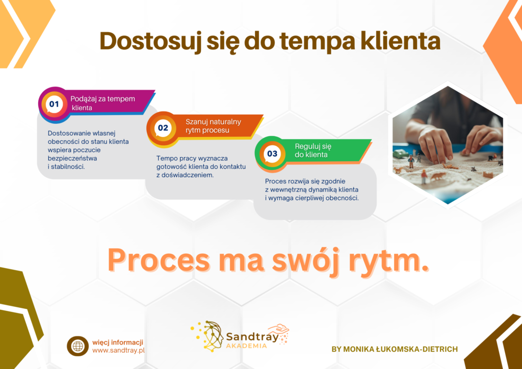 W metodzie Sandtray to klient wyznacza tempo pracy, a osoba prowadząca dostraja do niego swoją obecność. Szacunek dla naturalnego rytmu procesu wzmacnia poczucie bezpieczeństwa i gotowość do kontaktu z doświadczeniem. Proces nie przyspiesza się, on dojrzewa we własnym czasie.